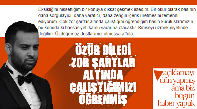 Siyasi kimliği ile değil bir okur olarak yorum yaptığını aktaran Koca şu ifadelere yer verdi; Dün yaptığım paylaşımda bazı ifadeler maksadını aşmıştır. Görüşlerim görev aldığım ve milletimize hizmet etmek için çalıştığım AK Parti’nin görüşünü içermez. Kendi sosyal medya hesabımdan yapmış olduğum, şahsıma ait bir görüştür. Maksadını aşan görüşlerimi AK Parti’ye mal etmeye çalışarak yapılan yıpratma çabaları ise manidardır. Görüşümü belirttiğim yazıda yapılan yatırımlara ve hizmetlere her hangi bir eleştiri söz konusu değilken, kasti olarak bu olayı siyasallaştıran ve hatta olayı Sayın Bakanımız Lütfi Elvan’a bağlamaya çalışıp, şapkadan tavşan çıkardığı sanan kişileri kamunun vicdanına bırakıyorum. Eksikliğini hissettiğim bir konuya dikkat çekmek istedim. Bir okur olarak basının daha sorgulayıcı, daha yaratıcı, daha zengin içerik üretmesini temenni ediyorum. Çok zor şartlar altında çalıştığını öğrendiğim basın kuruluşlarımızın bu konuda ki hassasiyeti kamu yararına olacaktır. Kimseyi üzmek niyetinde değilim. Üzdüğümüz dostlarımız olmuşsa affola”