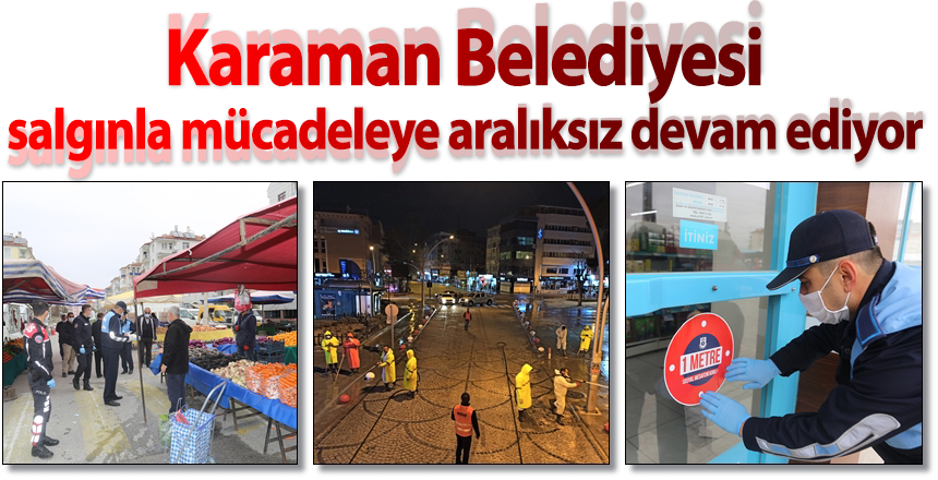 Karaman Belediyesi salgının risk oluşturmaya başladığı günden itibaren önlem ve tedbir amaçlı yürüttüğü çalışmalarda, cadde ve sokakların baştan sona yıkanıp temizlenmesi çalışmalarına her gün periyodik olarak devam ediyor. Yine çalışmalar kapsamında cadde ve sokaklar tek tek ilaçlanırken, kamu kurum ve kuruluşlar başta olmak üzere il genelindeki esnaflarda dezenfekte çalışmaları aralıksız sürüyor.