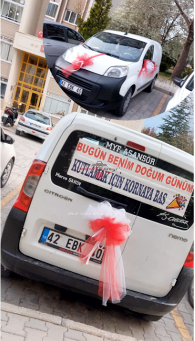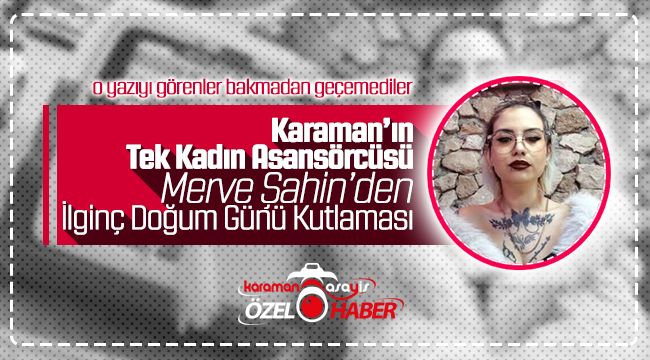 Karaman’da baba mesleği asansör ustalığını devam ettiren Merve Şahin doğum gününde otomobilinin arkasına ‘’ Bugün Benim Doğum Günüm Kutlamak İçin Kornaya Bas ‘’ yazılı bir afiş astı. Otomobili ile kentte bir süre tur atan Şahin’e Karaman halkı tepkisiz kalmadı. Yazıyı görenler araçlarının kornasına basarak genç kadının doğum gününü kutladı.