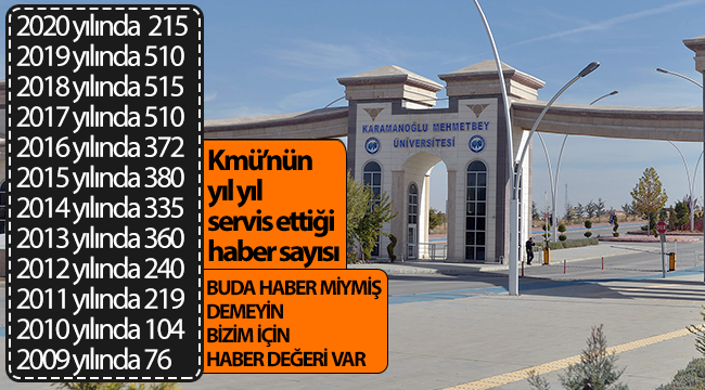 Karamanoğlu Mehmetbey Üniversitesi Kurumsal İletişim Koordinatörlüğü, 2020 yılında pandemi dönemine rağmen 215 haber yayımlayarak ildeki yerel basın kuruluşlarına içerik desteği sağlamaya devam etti. KMÜ Kurumsal İletişim Koordinatörlüğü tarafından ildeki basın kuruluşlarına 2019 yılında 510, 2018 yılında 515, 2017 yılında 510, 2016 yılında 372, 2015 yılında 380, 2014 yılında 335, 2013 yılında 360, 2012 yılında 240, 2011 yılında 219, 2010 yılında 104 ve 2009 yılında ise76 adet haber gönderilmişti.
